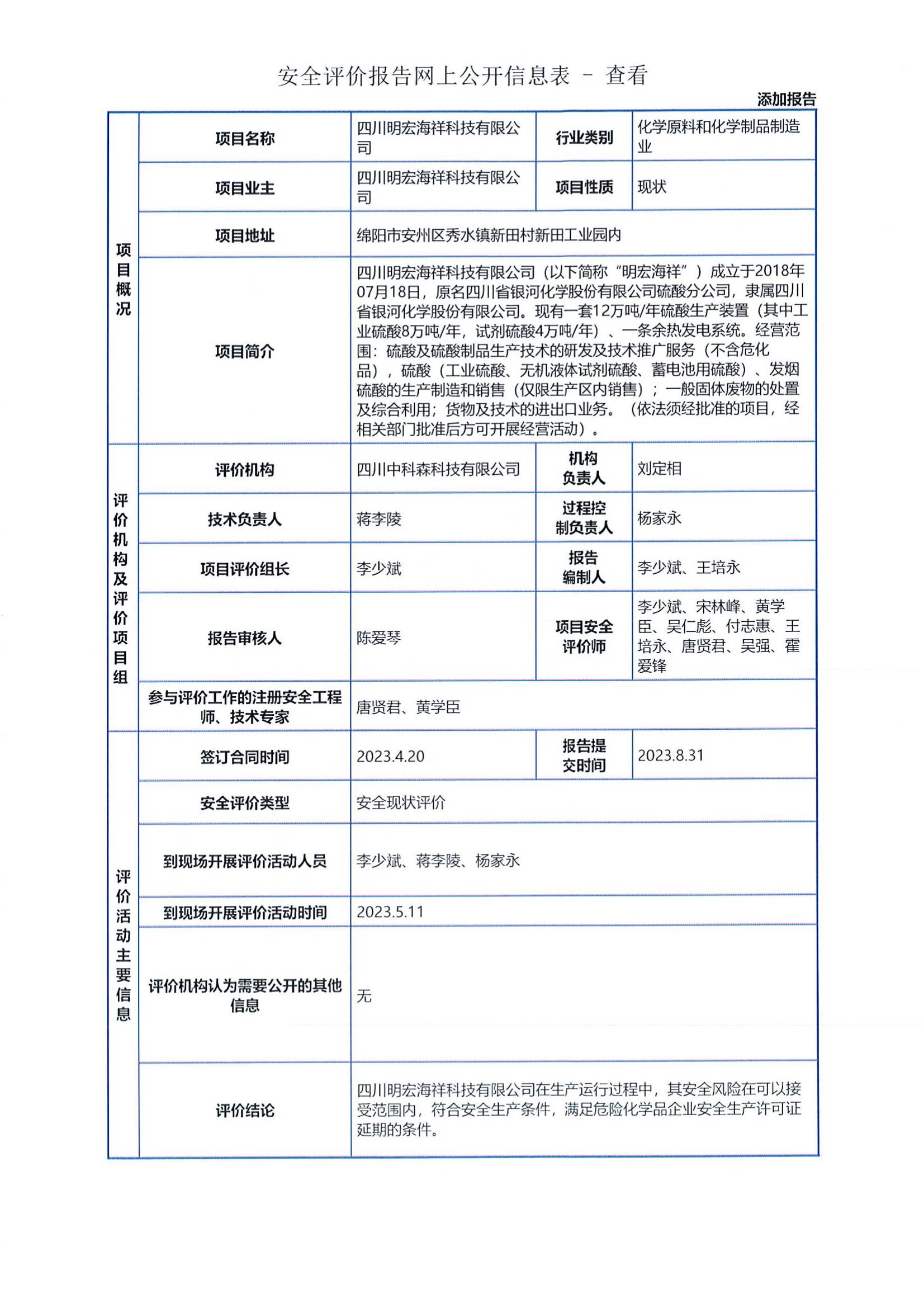 四川明宏海祥科技有限公司委托我司于2023年5月11日对该公司危险化学品生产装置的生产作业场所、储存场所、使用场所、经营场所及设备设施进行了现场勘察和数据采集,在对资料收集、计算和整理的基础上,根据《安全评价通则》和《危险化学品生产企业安全评价导则(试行)》,结合《危险化学品生产企业安全生产许可证实施细则》的相关要求,编制完成了《四川明宏海祥科技有限公司安全现状评价报告》。